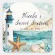 Hermoso pegatina dulce dieciséis con faro náutico blanco y negro, pez estrella y conchas. Perfecto para una dulce fiesta de 16 años. Las palabras se pueden cambiar para adaptarlas a sus propios detalles o requisitos