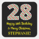 Este divertido y sencillo diseño de pegatina de Navidades con temática de cumpleaños 25 de diciembre presenta un gran número de "28", con un patrón de rayas verdes, blancas y rojas. También incluye el mensaje "Feliz cumpleaños 28 y Feliz Navidad", y un nombre personalizado. El fondo es negro de color. Pegatinas como este podrían ser usados al preparar regalos o regalos que se dan a alguien que nació el Día del Navidad (25 de diciembre) y que está celebrando su vigésimo octavo cumpleaños. [~Z0000409]