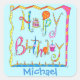 Estos pegatinas personalizados son muy divertidos para una fiesta de cumpleaños de niños. Este pegatina de Cumpleaños Feliz presenta letras caprichosas a mano usando globos, un quequito y pastel de cumpleaños, puntos y rayas para ayudar a formar la feliz palabra de cumpleaños. Las palabras "Happy Birthday" están rodeadas de un florido borde que destaca sobre un fondo azul turquesa. Las letras son multicolores de verde, naranja, fucsia rosa, azul turquesa y verde. Personaliza con un nombre debajo de la palabra arte para que los pegatinas ayuden con una celebración de cumpleaños o un fiesta.