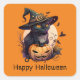 Pegatina Cuadrada Feliz Naranja Jack-o-Lantern de gato negro de Hall