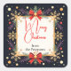 Este pegatina es un abrazo festivo en una plaza. Un fondo oscuro y elegante salpicado de brillantes toques dorados y rojos rodea un centro blanco. Las palabras "Feliz Navidad" están en un fluido guion rojo, con el personalizable de su nombre familiar debajo. El marco es una hermosa corona de copos de nieve dorados y blancos, brotes rosas y verdes y bayas rojas delicadas, todas atadas con dos audaces arcos rojos.