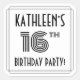 Este diseño inspirado en el estilo de los años 1920/1930, inspirado en la celebración de los 16 años/pegatina cuadrado fiesta, presenta un nombre personalizado, un lujoso estilo Art Déco inspirado en el número "16", el mensaje "¡PARTIDO DE CUMPLEAÑOS!" y un borde multilínea. Pegatinas como estos podrían ser usados para celebrar el 16 cumpleaños de alguien. [~Z0000618]