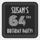 Este elegante diseño pegatina cuadrado de celebración de sesenta y cuatro años inspirado en los años 2000, presenta un nombre editable, un elegante estilo Art Déco inspirado en el número "64", el mensaje "¡FIESTA DE CUMPLEAÑOS!" y un borde multilínea. El fondo es negro de color de forma predeterminada, pero se puede personalizar a un color diferente, si se desea. Pegatinas como estos pueden ser usados o entregados en una fiesta de cumpleaños realizada en celebración del cumpleaños 64 de alguien, o tal vez usados al preparar invitaciones o regalos para un evento de este tipo. [~Z0000617]