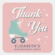 Pegatina rosa rubor por su fiesta de cumpleaños de patinaje sobre ruedas con "Gracias" en un guión de estilo de los años 70 y un ilustracion de inspiración retro de un verde azulado patinaje sobre ruedas azul. Personalice su nombre en una simple tipografía azul verde azulado oscuro.