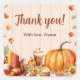 Adéntrate en el espíritu de la temporada con esta pegatina temática de especias de calabaza. Hojas de otoño caen alrededor del fondo con paneles beige para agradecer a los invitados por venir a la celebración de boda de otoño más acogedora de todas. Una gran calabaza, flores de otoño, velas, un café latte con especias de calabaza y una magdalena completan la escena. Utiliza la pegatina como sello de sobre o como simples agradecimientos en detalles en una celebración de boda con tema de especias de calabaza, fiesta de cumpleaños, fiesta de aniversario, fiesta de compromiso u otra reunión de otoño. Disponible con productos coincidentes.