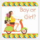 Invitar a la familia y amigos a que revelen su fiesta y hagan estos graciosos favores de fiesta presentando a una mujer que espera montada en una moto con regalos en la espalda. Todo el texto es totalmente personalizable para su propio género revelar fiesta. El género de bebés que coincide con el género de los bebés revela también las invitaciones de los partidos disponibles. En la parte superior e inferior del diseño hay un borde retro de color verde, naranja, amarillo y azul. Obra artística de Scooter Mom de Babystar Designs.