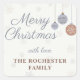 Este elegante pegatina cuadrado Navidad, bonito y moderno, presenta un suave fondo blanco cremoso con adornos navideños colgados en colores neutros y un patrón de copos de nieve de bonito. Personaliza tu nombre para un toque personalizado. Perfecto como sello para sobres para tarjetas de Navidades o invitaciones de partido de Navidades o como un favor de partido en un fiesta de Navidades.