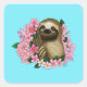 Un lindo perezoso sentado entre flores rosadas sobre un fondo azul