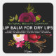 Estos pegatinas cuadrados negros son etiquetas para tubos de bálsamo labial. El diseño se compone de un ramo de flores con un texto en el centro