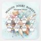 This charming watercolor illustration features a whimsical collection of French pastries and professional baking tools arranged in a vibrant cluster. A stack of multi-colored macarons, two glossy chocolate eclairs, and a slice of layered cream cake topped with berries serve as the centerpiece. They are accompanied by two golden-brown, flaky croissants. Integrated into the design are a wire whisk, a wooden rolling pin, and a piping bag ready for decorating. The artwork is beautifully accented with soft blue and pink watercolor washes and shimmering gold leaf flecks, creating an elegant, artistic tribute to the craft of pastry making.