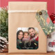 Esta bella y moderna pegatina de Navidad en negro, rojo, verde, blanco y dorado muestra tu foto y el sentimiento de "alegría" en caligrafía de escritura con letras a mano entre el oro y las bayas rojas y la vegetación de los Navidades y el año sobre un fondo negro. Fácil de personalizar con sus propias fotos y año.