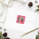El diseño de un pegatina fotográfico de vacaciones cuadradas para los amantes de los perros incluye una foto favorita de su perro mascota (o gato) con un patrón de huellas de pata blanca en un marco rojo. Sugerencia: recortar la foto en un formato cuadrado antes de subirla al sitio.