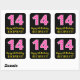 Este alegre diseño de pegatina cuadrado con temática de cumpleaños cuenta con un gran número de rayas "14", de color rosa oscuro y rosa claro. También incluye el mensaje "Feliz cumpleaños número 14", y un nombre de personalizable. El fondo es negro de color. Pegatinas divertidos, alegres y personalizados como este pueden ser dados como regalo de cumpleaños, o usados al envolver regalos, o quizás usados como decoraciones de fiestas de cumpleaños cuando se celebra el décimo cuarto cumpleaños de alguien. [~Z0000578]