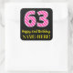 Este alegre diseño de pegatina cuadrado con temática de cumpleaños presenta un gran número "63" con un patrón de franjas rosa claro y rosa oscuro, junto con el mensaje "Feliz cumpleaños número 63", y un nombre personalizado. El fondo es negro de color. Pegatinas divertidos, alegres y personalizados como este pueden ser dados como regalo de cumpleaños, o usados al envolver regalos, o quizás usados como decoración de fiestas de cumpleaños cuando se celebra el sesenta y tercer cumpleaños de alguien. [~Z0000578]
