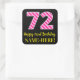 Este alegre diseño de pegatina cuadrado con temática de cumpleaños incluye un gran número "72" con un patrón de franjas rosa claro y rosa oscuro, junto con el mensaje "Feliz cumpleaños número 72", y un nombre de personalizable. El fondo es negro de color. Pegatinas divertidos, alegres y personalizados como este pueden ser dados como regalo de cumpleaños, o usados al envolver regalos/regalos, o quizás usados como decoraciones de fiestas de cumpleaños cuando se celebra el cumpleaños 72 de alguien. [~Z0000578]