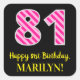 Este alegre diseño de pegatina cuadrado con temática de cumpleaños cuenta con un gran número de rayas "81", de color rosa oscuro y rosa claro. También incluye el mensaje "Feliz cumpleaños número 81", y un nombre editable. El fondo es negro de color. Pegatinas divertidos, alegres y personalizados como este pueden ser dados como regalo de cumpleaños, o usados al envolver regalos/regalos, o quizás usados como decoración de fiestas de cumpleaños cuando se celebra el cumpleaños 81 de alguien. [~Z0000578]