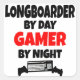 Este diseño de texto incluye la frase de moda "Longboarder by Day Gamer by Night" y es perfecto para cualquier longboard que ame jugar juegos de ordenador o videojuegos.