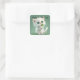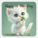Una adorable imagen de un gatito blanco sosteniendo un trébol, aparece en este sticker cuadrado para el Día de San Patricio. Con el mensaje, "Feliz Día de San Patricio", use este sticker para esos envíos especiales, decoración, scrapbooking y más para la festividad irlandesa.