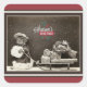 Fotografía navideña vintage con un gato super lindo vestido con un vestido de vacaciones con la mano caliente. El gato está tirando un trineo de regalos envueltos. Mensaje: Saludos de temporada.