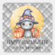 Un dulce gato negro de acuarela con sombrero de bruja y calabazas, sobre un fondo de cuadros grises. Estas pegatinas personalizadas de Halloween son ideales para familias que quieren agregar un toque festivo a las bolsas de truco o trato, favores de fiesta y regalos de temporada. Personaliza con tu nombre para hacer que tus golosinas de Halloween sean aún más especiales.