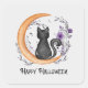 Este diseño presenta un gato negro sentado en una luna creciente rodeado de flores moradas y la frase "Feliz Halloween". Es perfecto para una celebración de Halloween.