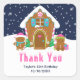 Este pegatina de agradecimiento es bonito y festivo y cuenta con una casa de pan de jengibre adornada con dulces rosas y verdes. Al lado hay adorables hombres de jengibre con regalos, vestidos con sombreros de Santa y una bufanda. En el fondo hay un cielo azul marino de invierno con elegantes copos de nieve cayendo. El texto combina fuentes decorativas y sans serif para un estilo elegante y moderno. Esto es perfecto para una fiesta de cumpleaños temática de Navidades.