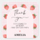 Moderno Pink Gingham Berry Sweet 1.ᵉʳ Birthday Square Pegatina Moderno y dulce rosa y rojo nuestro dulce cumpleaños gracias a pegatina que presenta un patrón de manjares rosados, fresas acuarelas, arco rosado y una imagen moderna de encabezado de caligrafía.