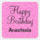 Pegatina cuadrado de glamur feliz cumpleaños con un fondo brillante purpurina rosado caliente y una elegante escritura negra. Puede agregar fácilmente el nombre de su elección y cambiar el color y la fuente del nombre utilizando la opción personalizar.