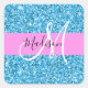 Glam y girly azul celeste / aqua y purpurina rosa destella nombre de monograma blanco y pegatina cuadrado inicial. Su nombre personalizado y su monograma están escritos en un guión elegante con letras a mano con un fondo rosado. Puede cambiar el color del texto y el estilo y el tamaño del tipo de letra mediante la opción personalizar. ¡Un regalo perfecto de cumpleaños o Navidades!