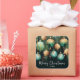 Elegant Merry Christmas holiday stickers feature pine branches, green and gold Christmas ball ornaments and ribbons on a dark green background with your nain chic lettering, perfect for your festive holiday gathering or for your gift-giving.