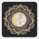 A symmetrical mandala design featuring intricate a yin yang floral pattern in gold and silver.