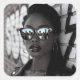 This sticker depicts an African-American woman wearing sunglasses that reflect the city's skyline. She is standing against a wall full of graffiti street art and the whole illustration is in black and white.