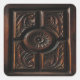 Este pegatina está decorado con una bonita madera artística en tonos marrones, dorados, caoba y negros. Una imagen central abstracta de una flor circular tiene pétalos que irradian en un círculo tallado que está rodeado por cuatro secciones. Cada sección tiene tallados abstractos de hojas.