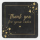 > Elegante "gracias por tu pedido" pegatina, fondo negro con textura acuarela, Relieve metalizado de oro escrito a mano en caligrafía moderna, confeti dorado brillante en las esquinas, delgado borde de marco dorado, pequeño icono cardíaco en oro bajo el texto, alta resolución, lujoso y llamativo estilo, listo para imprimir
