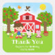 Esta divertida y linda pegatina presenta a una chica de pelo marrón con piel clara junto a un granero rojo con una veleta de gallo. Hay adorables animales de granja como una vaca, un cerdo y una gallina. Al fondo hay un cielo azul brillante, manzanos, sol, mariposas y margaritas. El texto combina fuentes en negrita y sans serif para un estilo moderno y elegante. Esto es perfecto para una fiesta de cumpleaños con tema de granja.