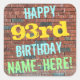 Este divertido diseño de pegatina con temática de cumpleaños incluye un mensaje como "FELIZ 93 cumpleaños, NOMBRE AQUÍ!", donde el nombre puede ser personalizado. El fondo está representado por una pared de ladrillo de ladrillo marrón rojizo. El texto del mensaje de personalizable presenta colores como azul, amarillo y verde, y tiene un aspecto inspirado en el de los graffitis pintados. Pegatinas como estos podrían ser dados como regalo de cumpleaños, o quizás ser usados como decoraciones en una fiesta de cumpleaños para alguien que está celebrando su cumpleaños noventa. [~Z0000273]