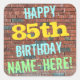 Este divertido diseño de pegatina con temática de cumpleaños incluye un mensaje como "FELIZ 85º CUMPLEAÑOS, NOMBRE - AQUÍ!", donde el nombre puede ser personalizado. El fondo está representado por una pared de ladrillo de ladrillo marrón rojizo. El texto del mensaje de personalizable presenta colores como azul, amarillo y verde, y tiene un aspecto inspirado en el de los graffitis pintados. Pegatinas como estos podrían ser dados como regalo de cumpleaños, o quizás ser usados como decoraciones en una fiesta de cumpleaños para alguien que está celebrando su cumpleaños número ochenta y cinco. [~Z0000273]
