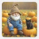 Pegatina Cuadrada Granjero de nome y gatito negro en calabazas