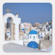 Pegatina Cuadrada Grecia, Santorini. Torre de campanas y cúpulas azu