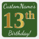 Pegatina Cuadrada Green, Faux Gold 13th Birthday + Custom Name