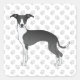 El original ilustracion personalizado de Destei de un perro de raza Greyhound italiano de color blanco y negro. El fondo tiene un patrón de huellas de pata de perro en color gris claro.