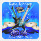 Un azul audaz y vívido con guitarras eléctricas, tambores y altavoces subwoofer en la parte delantera y un gorro de graduación y diploma en la parte posterior. ¡Perfecto para una fiesta de graduación de rockin!