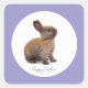 Süßes Kaninchenjungtier schaut erwartungsvoll auf weißem Untergrund.