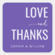 This square sticker features a warm and heartfelt design with a deep purple background. The layout includes bold, uppercase text in a modern sans-serif font, complemented by an elegant cursive script connecting the words "LOVE" and "THANKS." The overall style is clean and celebratory, conveying gratitude and affection. Perfect for personalizing gifts or expressing appreciation, this sticker adds a touch of warmth to any occasion.