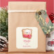 Hecho con amor pegatinas personalizados con una cara de oso adorable y adorable puesta en una base de galletas. Llevando una bufanda de rayas rojas y blancas.