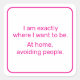 Este pegatina es una vibración. Úsalo para declarar tu preferencia por la soledad pacífica. El texto rosa cálido dice: "Estoy exactamente donde quiero estar. En casa, evitando a la gente". Otros colores disponibles son azul oscuro, rojo oscuro, negro y verde oscuro.