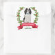 En estos pegatinas por correspondencia de Holiday, un retrato de un perro de Cavalier blanco y negro, el rey Charles Spaniel, está rodeado por una corona de bayas rojas. En la parte inferior hay un cartel rojo con el saludo de sus Navidades personalizados, y su firma está en verde debajo.