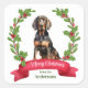 Pegatina Cuadrada Holly Wreath Black Tan Coonhound Navidades