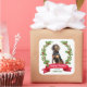 En estos pegatinas por correspondencia de Holiday, un retrato acuarela de un perro negro y moreno está enmarcado por una corona de bayas rojas. En la parte inferior hay un cartel rojo con el saludo de sus Navidades personalizados, y su firma está en verde debajo.