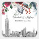Invitaciones y accesorios personalizables con una vista de aspecto grabado en negro y blanco del icónico horizonte de la ciudad de Nueva York con el Emp St Building y un borde floral con colores de invierno.===========